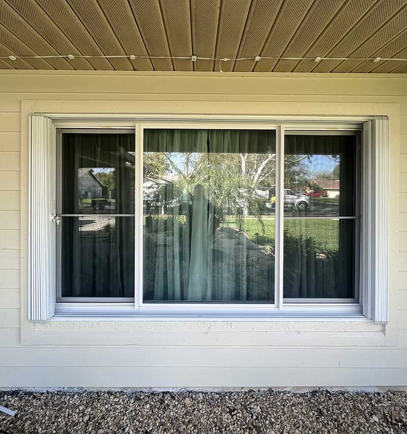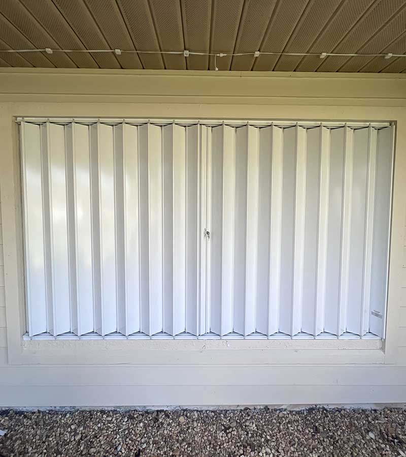 Accordion shutters have aluminum blades that run along aluminum tracks on the top and bottom.